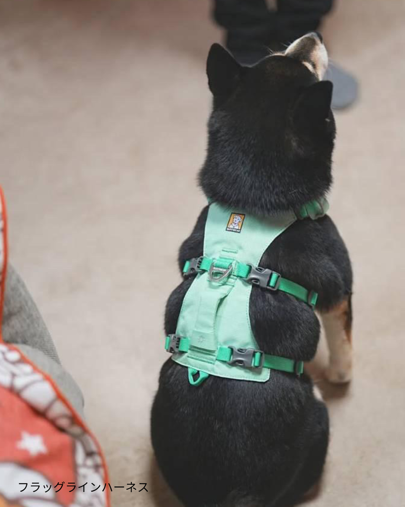 ラフウェアのフラッグラインハーネスは、6か所のアジャスターでサイズ調整ができ、首からしっぽに向かって体にぴったりとフィットするハーネスです。頭を通してから胴回り4か所のバックルを留めるだけで着用でき、便利なサイドリリースバックルで着脱も簡単です。背面には岩場や車の乗り降り、介護などに便利な流線型で持ちやすいリフトハンドルが付いています。サポート力のある胸部・腹部パネルでバランスよく快適に持ち上げることができます。リーシュは背面に2か所(軽量で強いアルミニウム製Vリングと強化ウェビングループ)、胸元に1か所(強化ウェビングループ)の計3か所に取り付けが可能で、胸元のループにリーシュを取り付けると引っ張る犬の方向転換がしやすくなります。暗い場所で視認性を高める反射トリムが胸元に4か所あり、背面にはビーコンを取り付けるためのループも付いています。シリーズには、フラッグラインリーシュがあり、お揃いでコーディネートすることもできます。